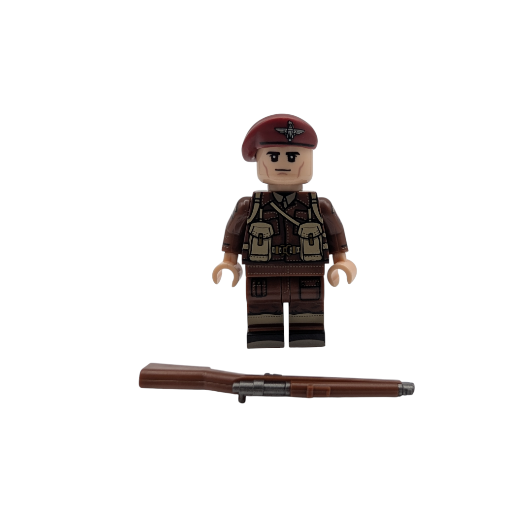 The British WW2 Parachute Regiment Major minifigure embodies the authority and presence of senior airborne officers who directed daring missions across Europe. Wearing the famous maroon beret with the Parachute Regiment insignia, this figure’s uniform is finely detailed with officer webbing, pistol holster, and command equipment. His stern facial print reflects the heavy responsibility of leading men into the uncertainty of airborne assaults.