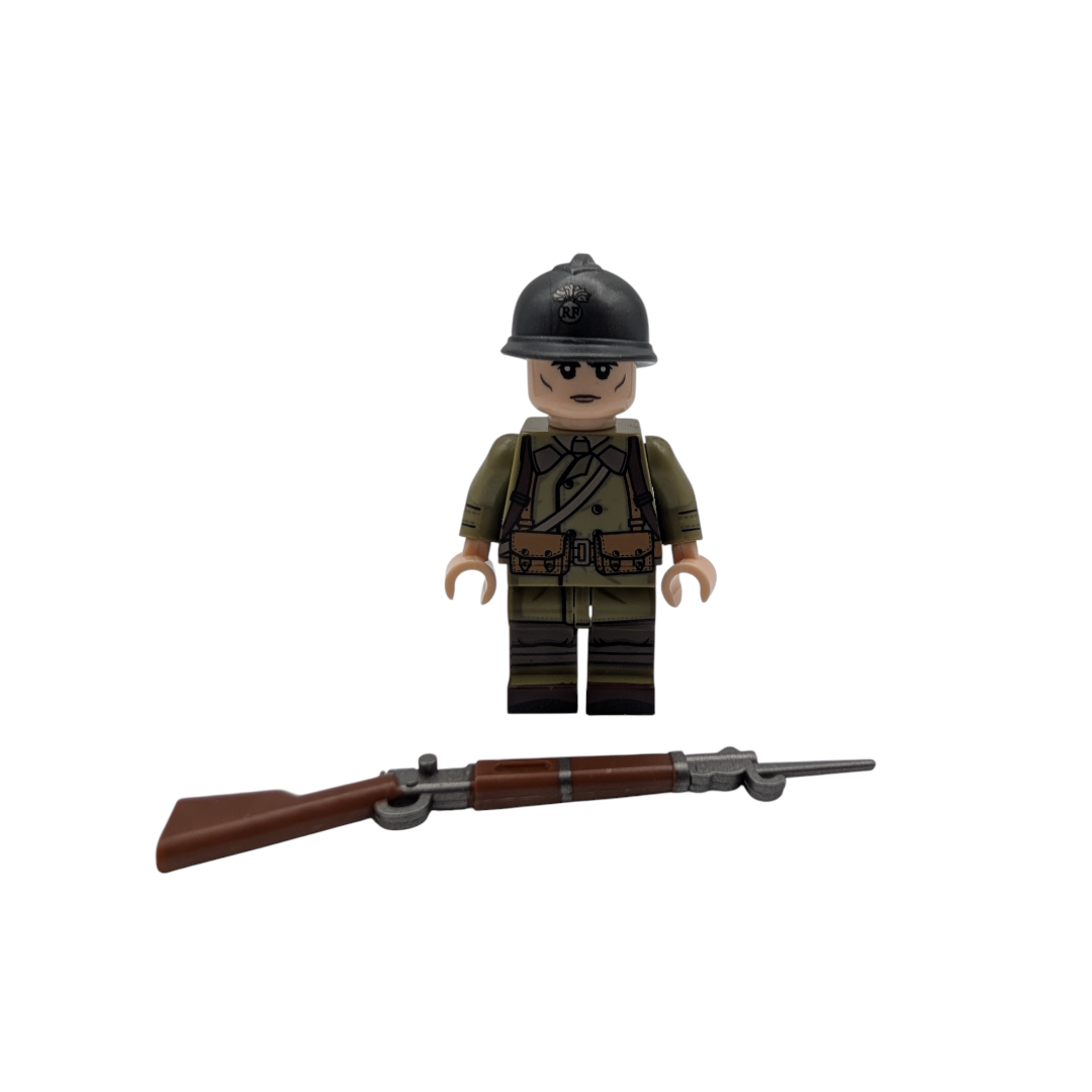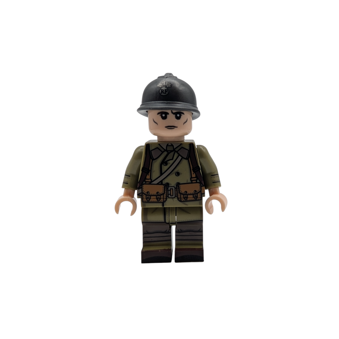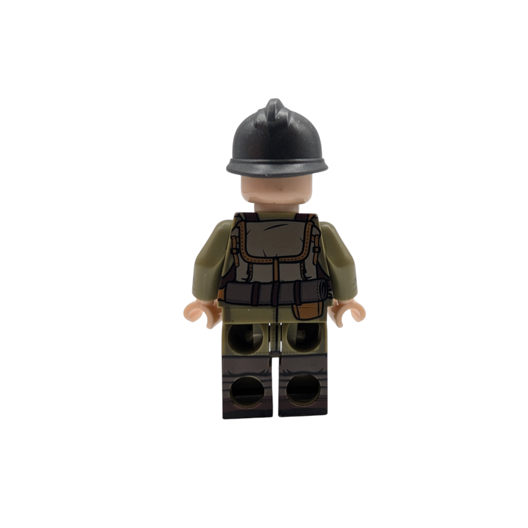 This French WW2 Infantry minifigure represents the valiant soldiers of France in 1940, this minifigure wears the classic Adrian helmet with the French insignia, paired with olive uniform printing and leather cartridge pouches. His facial expression, calm yet serious, reflects the determination of men who stood against the German blitzkrieg.