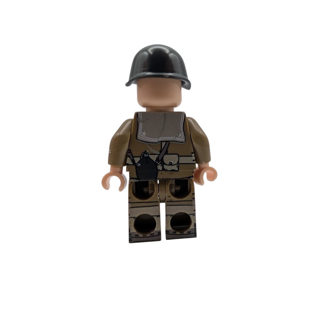 The San Marco Private minifigure captures the average Italian naval infantryman during WWII. Wearing a tan uniform with printed field gear and helmet insignia, this figure reflects the daily reality of soldiers tasked with amphibious landings, coastal defence, and naval security.