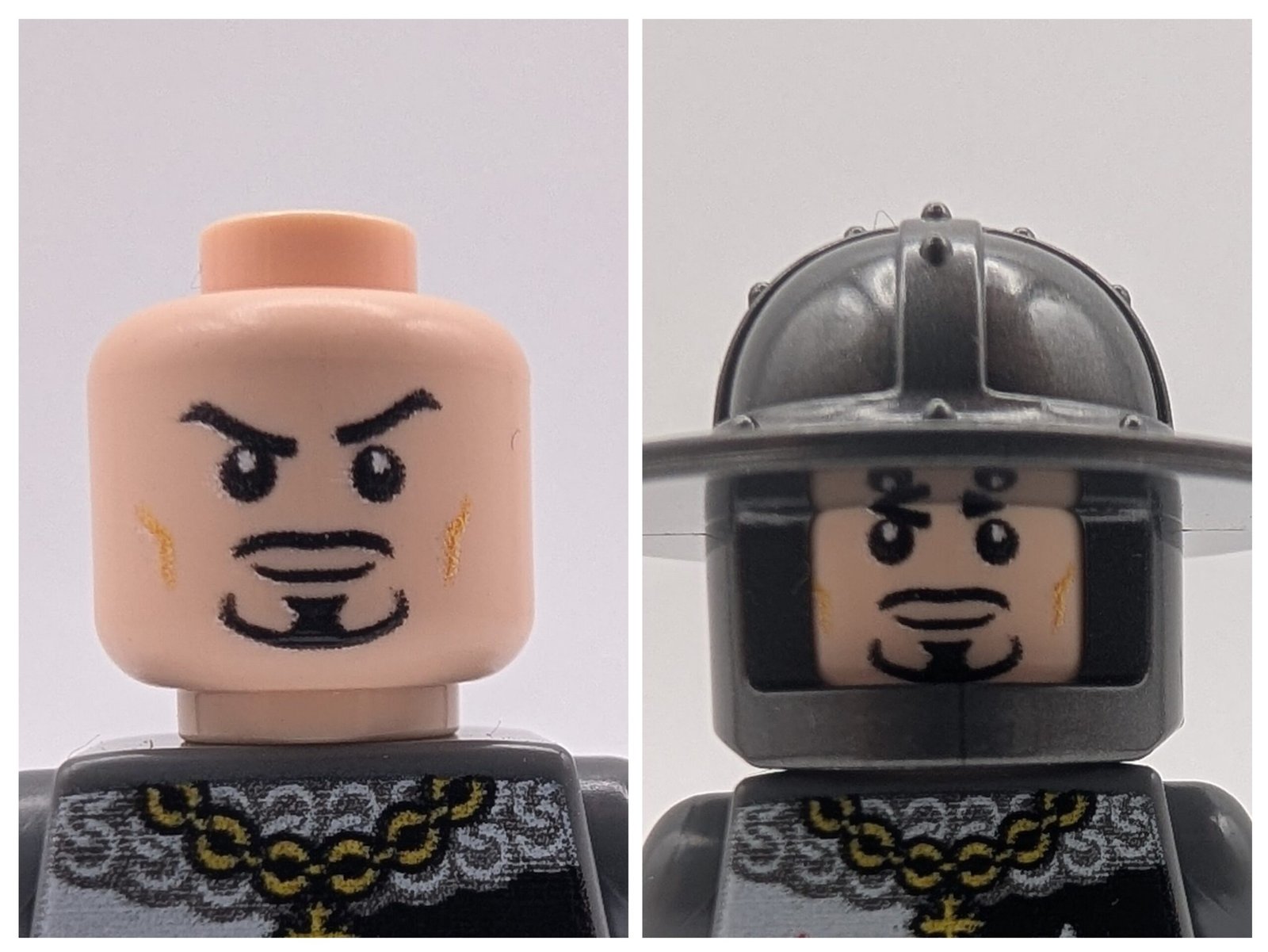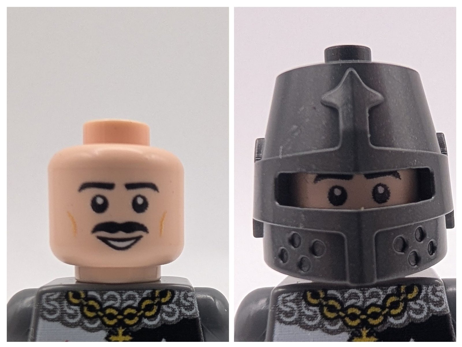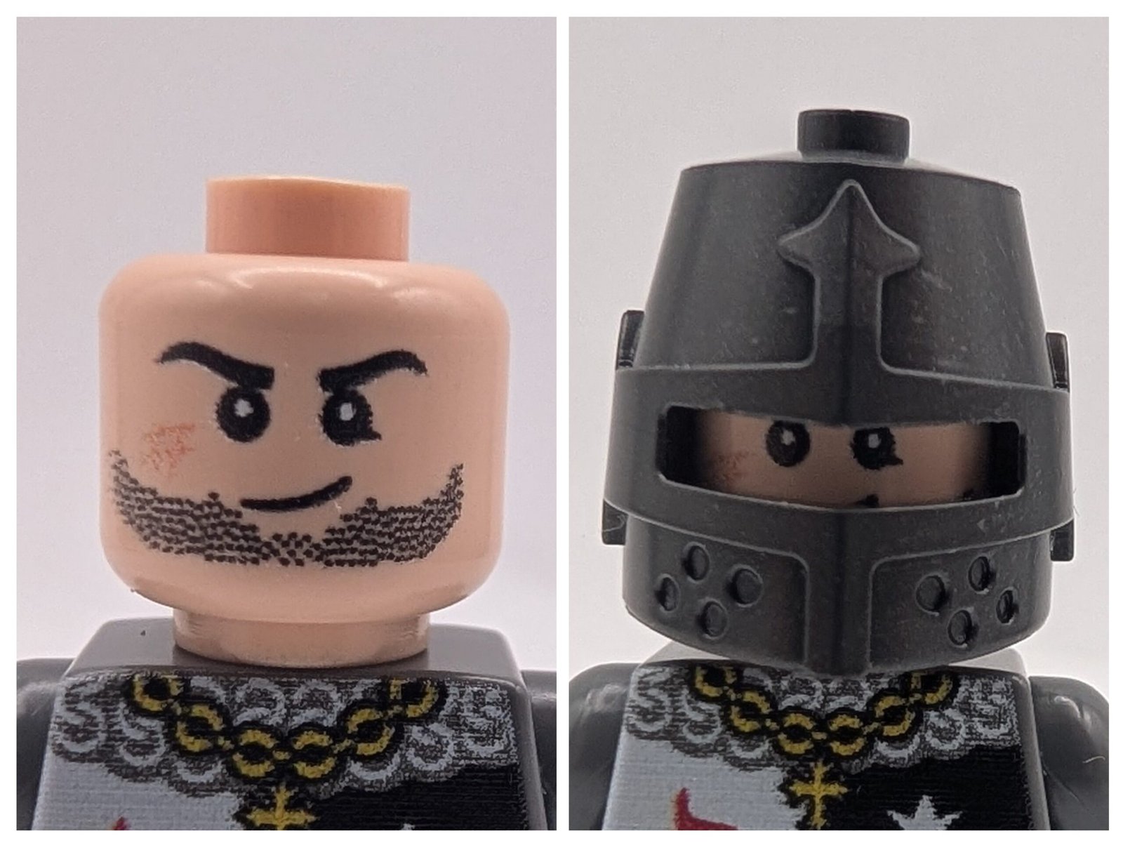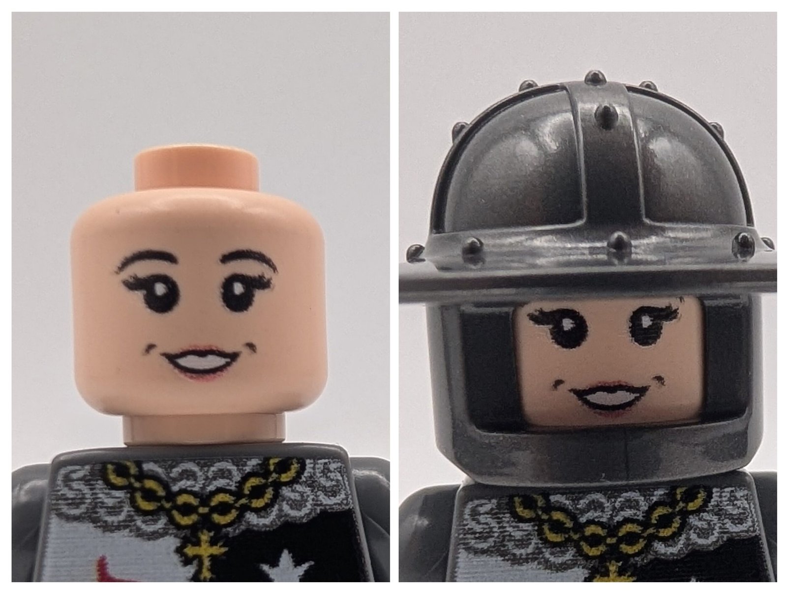 This minifigure knight comes equipped with a broad sword, a printed kite shield with quartered heraldry, and variable enclosed helmets from the 13th century. The torso is decorated with chainmail patterns and insignia, while the black legs add to the battle-ready look.